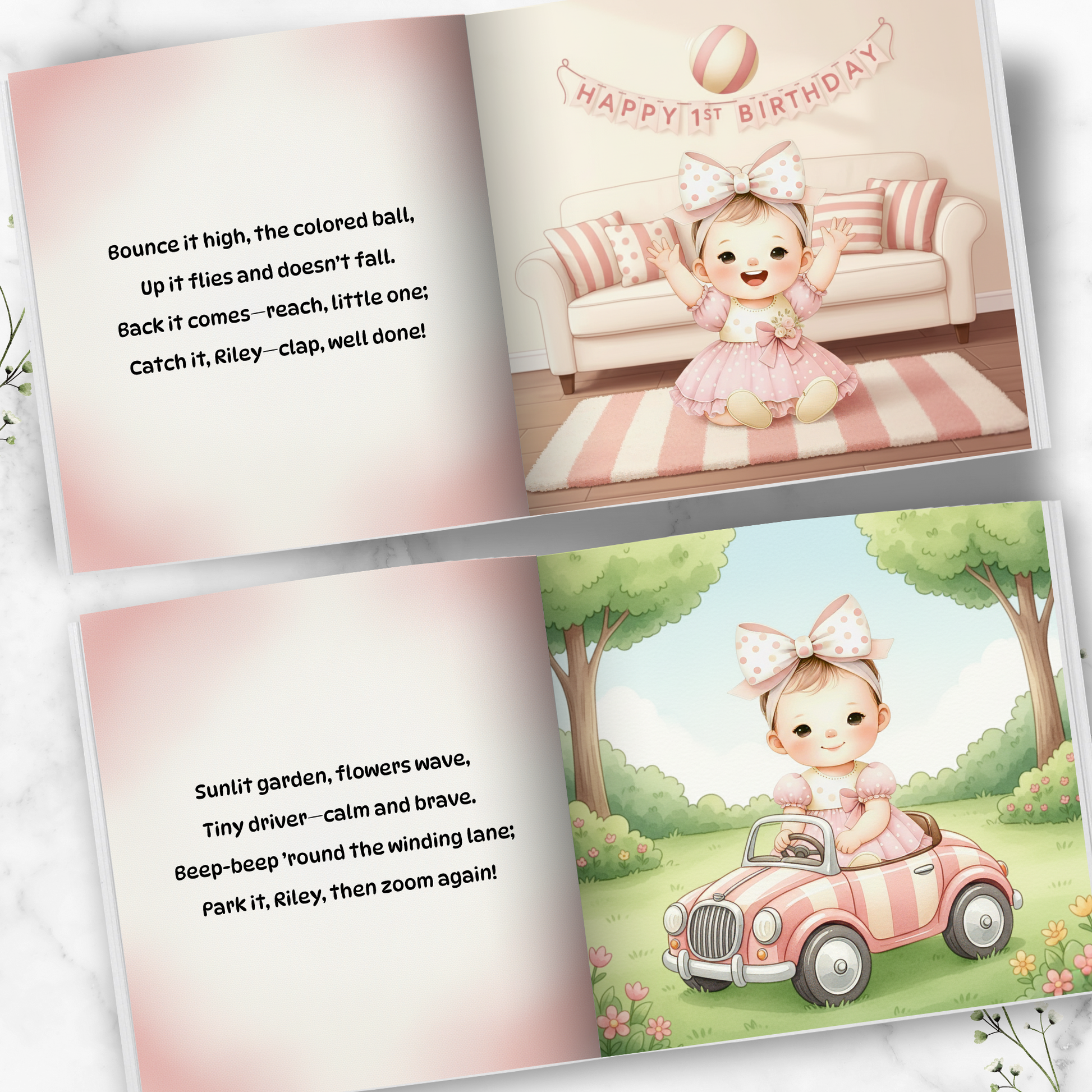 Celebrate your little girl turning one with a cheerful, personalized storybook. Her name appears on the cover and throughout the pages as sweet rhymes and festive illustrations mark the big milestone—cake, candles, and happy wishes. A keepsake families treasure long after the party.